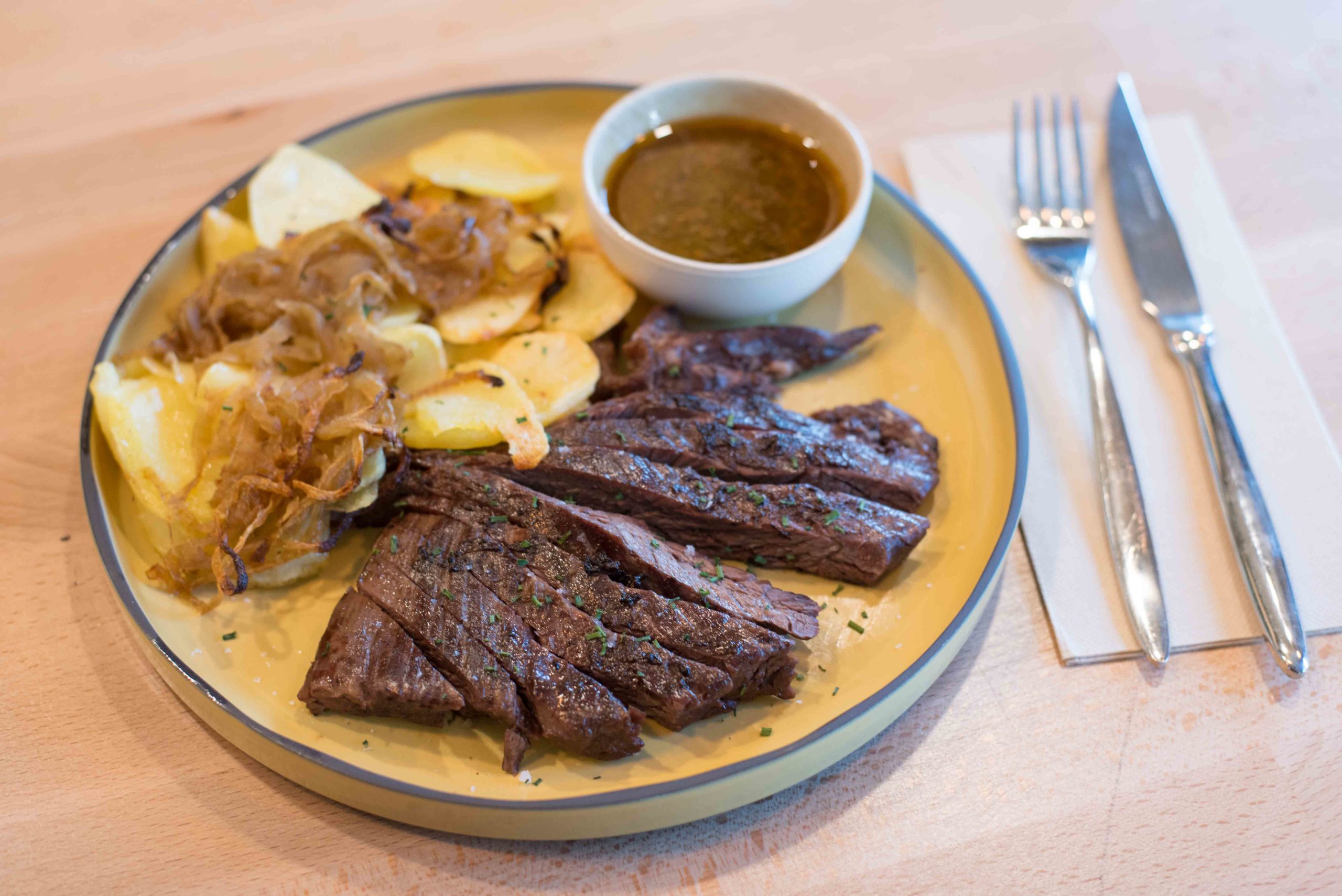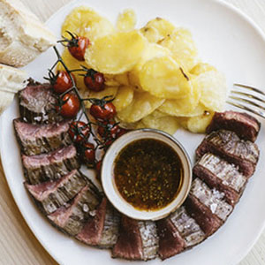 Cocinamos durante 5 horas la entraña a baja temperatura y con su jugo y acompañamos por un chimichurri que elaboramos nosotros mismos. Vamos, que solo nos falta masajear a la vaca. ![]()