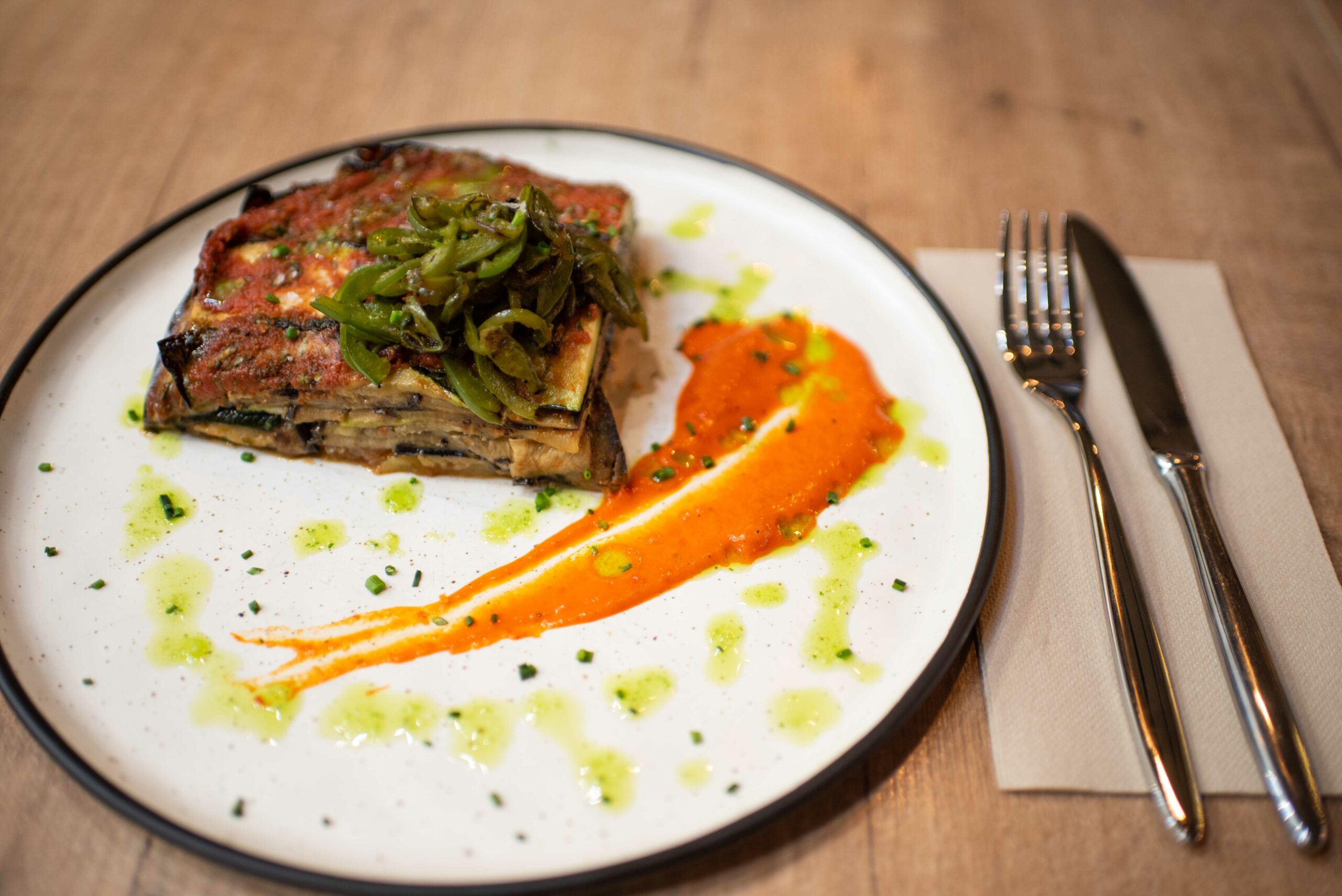 Una receta mallorquina. Varias capas de verduras asadas: patata, berenjena, tomate y pimiento verde salteado. Y acompañado de crema de piquillo. ![]()