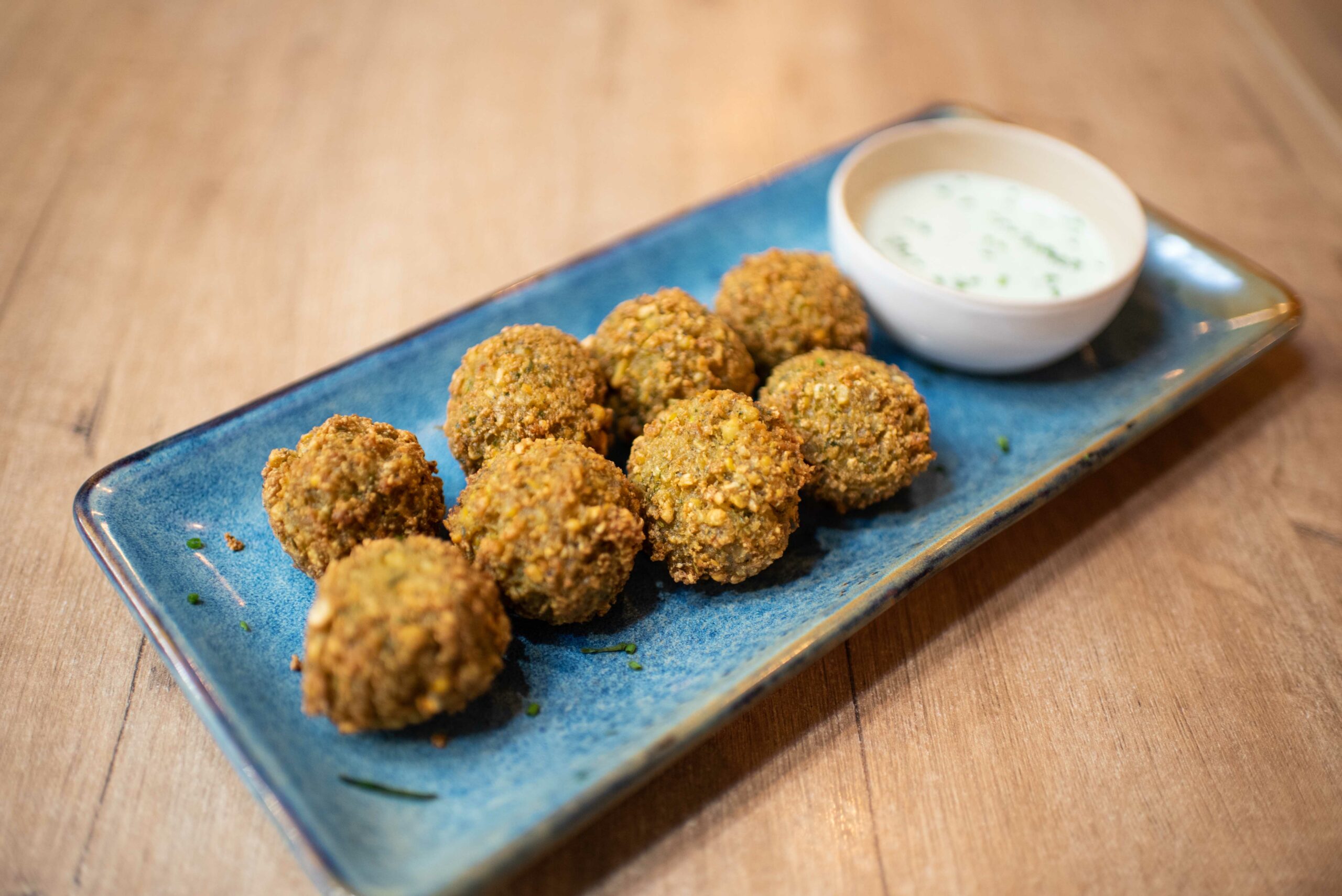 Croquetas super crunchy de pasta de garbanzo, acompañadas con una fresca salsa de yogur con pepino y menta. ![]()