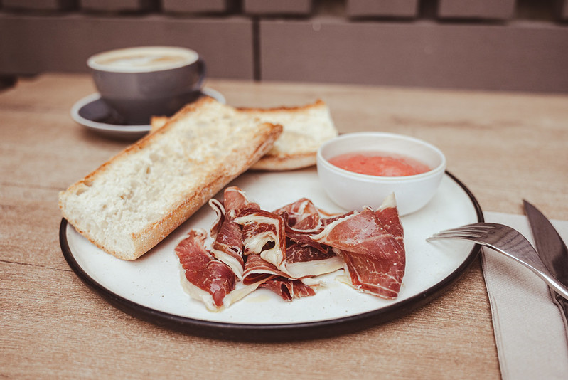 Huevos de gallinas felices con jamón del rico cortado en lasquitas. Pedirás doble ración de pan.
