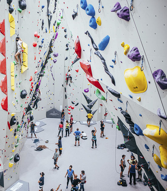 Each center offers a unique mix of high walls, auto-belays, bouldering, training areas, and a social Cantina (café/restaurant).